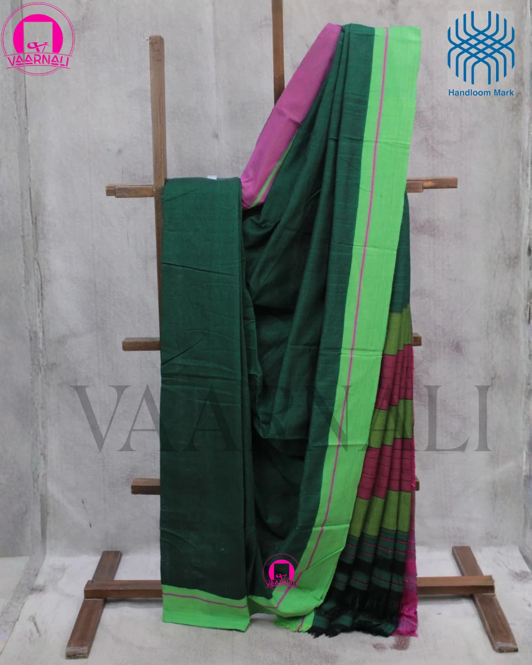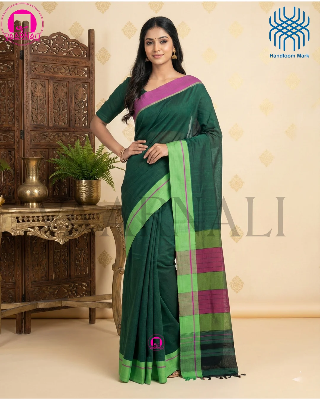 Crafted from 100% pure handloom cotton, this green saree offers unparalleled comfort and breathability, making it perfect for all-day wear in any season. The fabric drapes beautifully, creating elegant pleats that flow gracefully with every movement. The deep forest green body is enhanced with striking lime green and magenta pink accents on the border and pallu, creating a color symphony that's both traditional and refreshingly modern.