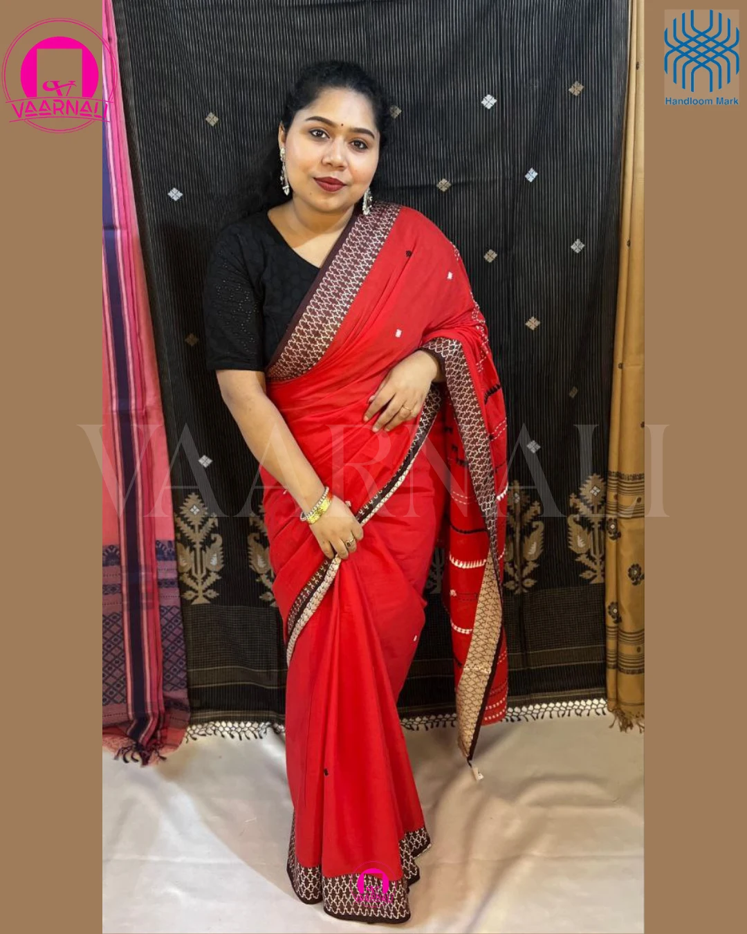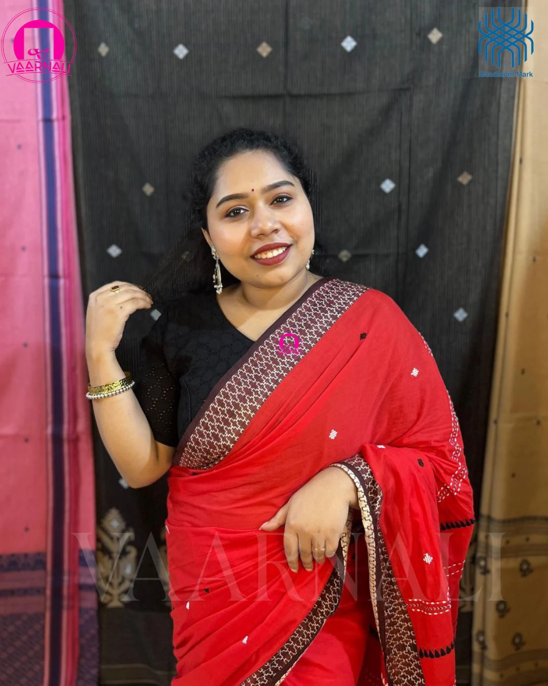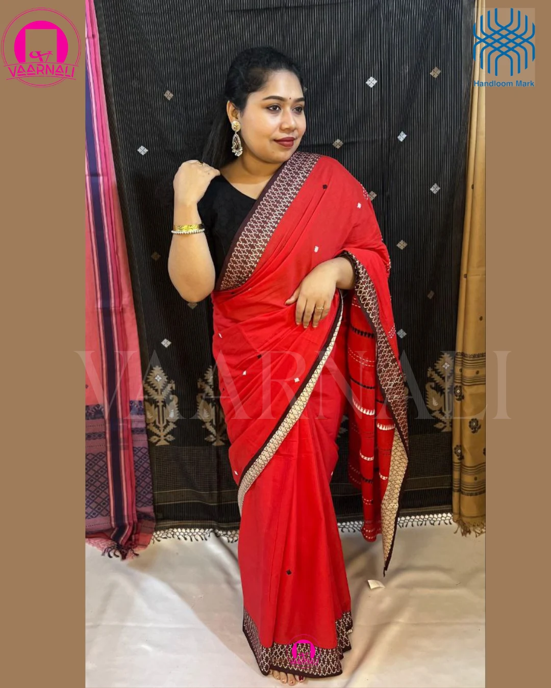 Step into the world of authentic Bengali handloom artistry with VAARNALI's stunning red Dhonekhali cotton saree. This exquisite piece embodies the rich weaving tradition of West Bengal's Dhonekhali region, where master weavers have perfected their craft over generations. The vibrant red body adorned with delicate motifs and complemented by a contrasting black border creates a mesmerizing visual symphony that captures attention effortlessly.