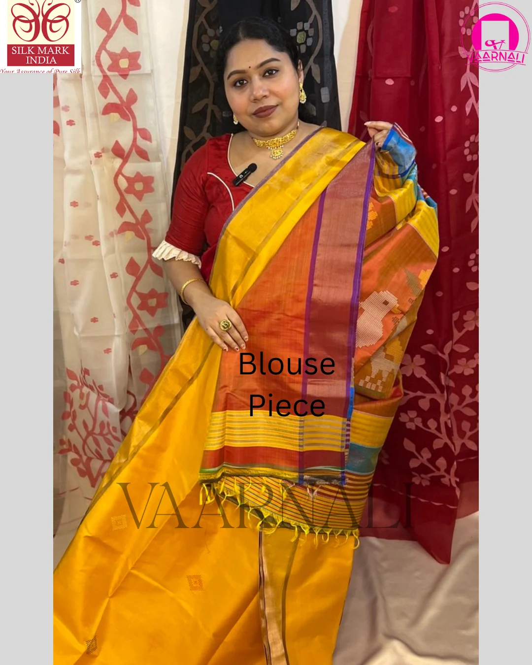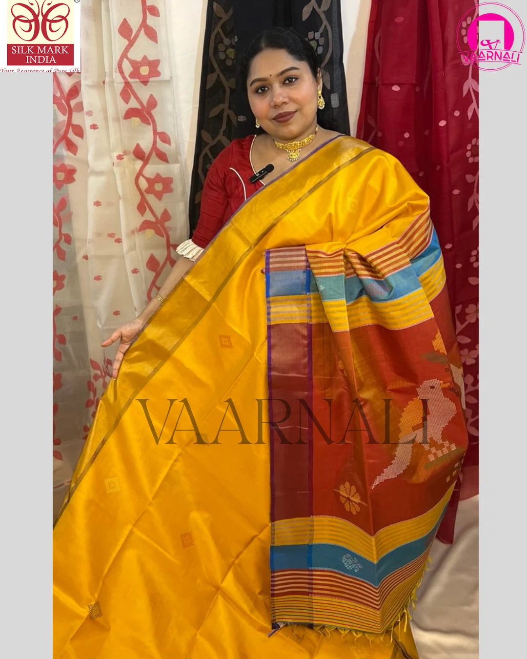 Draped in a luminous yellow red silk saree palette, this creation symbolizes prosperity, positivity, and celebration. It is designed for women who value cultural depth, refined elegance, and enduring craftsmanship.